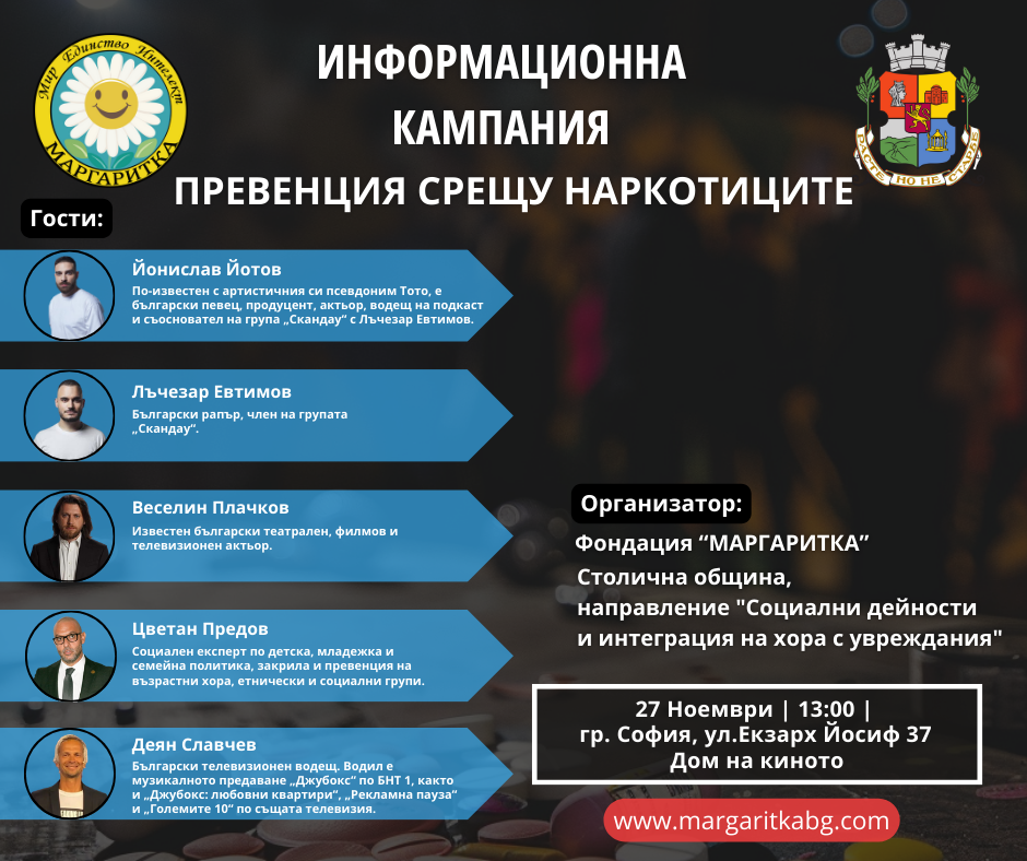 Фондация „МАРГАРИТКА“ организира за втори път информационна кампания с цел превенция срещу наркотиците.